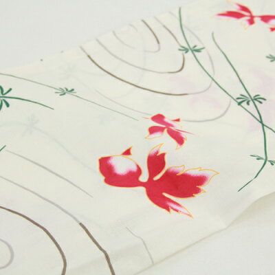 浴衣 金魚 セット レトロ 高級変わり織り綿麻浴衣3点セット「生成り地に赤い金魚と水草・波紋」 浴衣 クリーム 赤 古典柄
